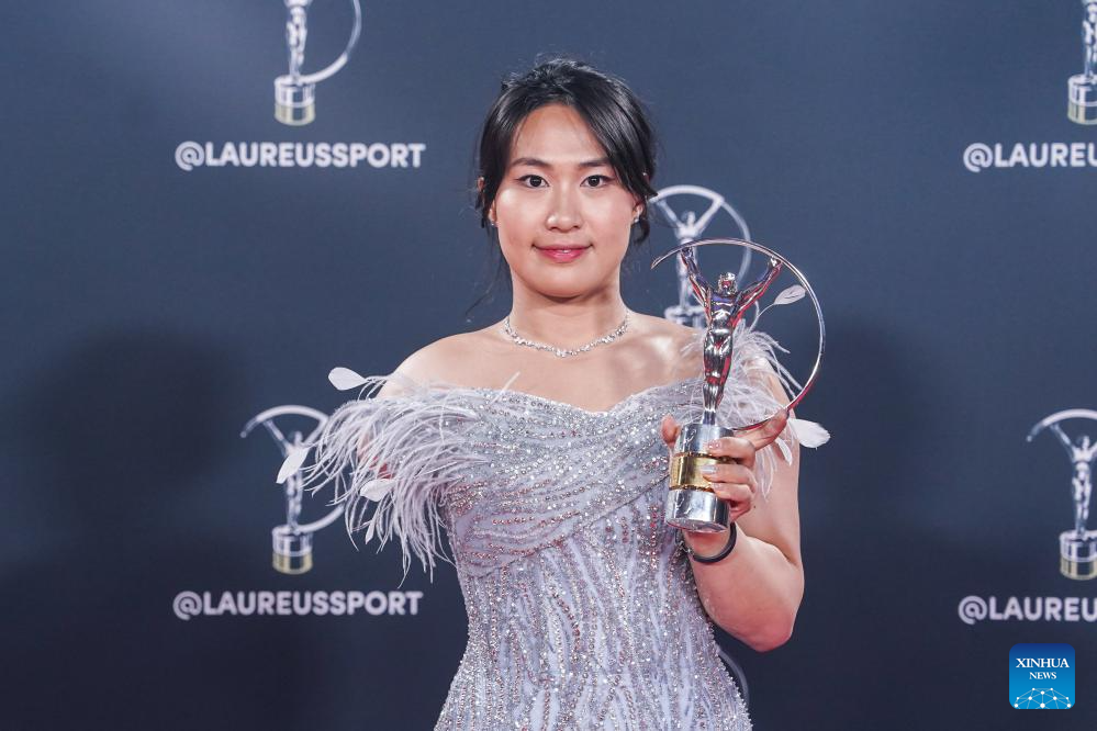 This file photo taken on April 21, 2025 shows Chinese paralympic swimmer Jiang Yuyan posing with the Sportsperson of the Year with a Disability Award trophy during the 26th Laureus World Sports Awards gala in Madrid, Spain. (Xinhua/Peng Ziyang)