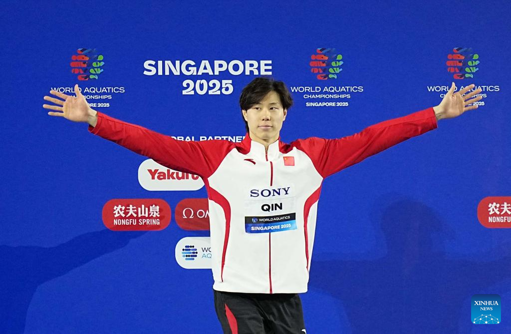 This file photo taken on July 28, 2025 shows gold medalist Qin Haiyang of China celebrating during the awarding ceremony for the men's 100m breaststroke final of swimming at the World Aquatics Championships in Singapore. (Xinhua/Xia Yifang)
