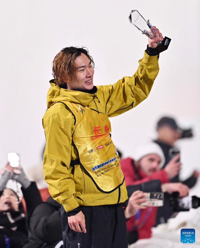 This file photo taken on Dec. 6, 2025 shows Su Yiming of China reacting after the awarding ceremony for the men's big air at the FIS Snowboard World Cup in Beijing, China. (Xinhua/Tao Xiyi)