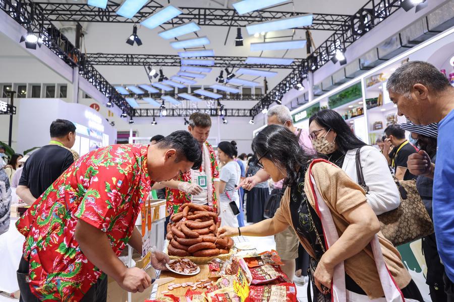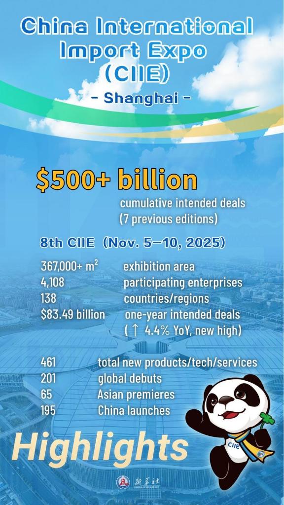 This photo taken on Nov. 3, 2025 shows a themed-decoration of the China International Import Expo (CIIE) at the National Exhibition and Convention Center (Shanghai) in east China's Shanghai. (Xinhua/Fang Zhe)Staff members perform at the pavilion of the United Arab Emirates during the eighth China International Import Expo (CIIE) in east China's Shanghai, Nov. 7, 2025. (Xinhua/Ren Pengfei)This photo shows a yoga event for one hundred participants organized by Lululemon outside the Consumer Goods Exhibition area during the eighth China International Import Expo (CIIE) in east China's Shanghai, Nov. 8, 2025. (Xinhua/Du Xinyi)Visitors view Tesla's Cybercab, which made its Asia-Pacific debut during the eighth China International Import Expo (CIIE) in east China's Shanghai, Nov. 6, 2025. (Xinhua/Fang Zhe)Visitors line up to taste Iberian ham from Spain at the Food and Agricultural Products exhibition area during the eighth China International Import Expo (CIIE) in east China's Shanghai, on Nov. 7, 2025. (Xinhua/Tian Weiwei)Exhibitors conduct a live streaming event at the booth of a New Zealand honey brand at the Food and Agricultural Products exhibition area during the eighth China International Import Expo (CIIE) in east China's Shanghai, on Nov. 6, 2025. (Xinhua/Liu Jiaqi)