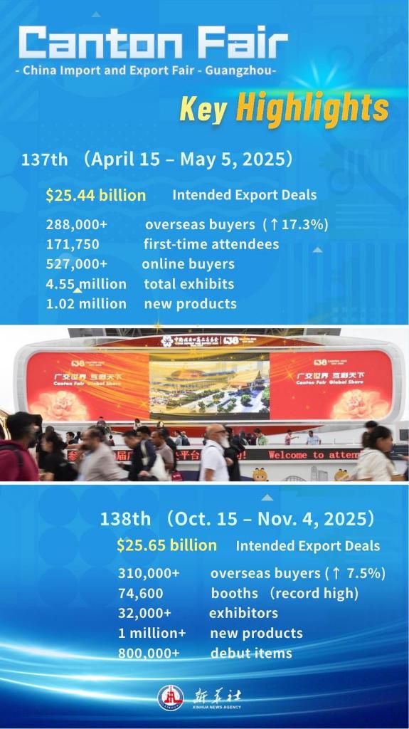 A man poses for a photo outside the venue of the 137th edition of the China Import and Export Fair in Guangzhou, south China's Guangdong Province, April 15, 2025. (Xinhua/Deng Hua)This photo taken on Oct. 15, 2025 shows a scene during the 138th edition of the China Import and Export Fair in Guangzhou, south China's Guangdong Province. (Xinhua/Deng Hua)Purchasers talk with an exhibitor at a garment booth at the 137th China Import and Export Fair in Guangzhou, south China's Guangdong Province, May 5, 2025. (Xinhua/Huang Guobao)Purchasers attend the 137th China Import and Export Fair in Guangzhou, south China's Guangdong Province, May 5, 2025. (Xinhua/Huang Guobao)Foreign buyers pose for a group photo with a humanoid robot at the service-robot zone during the 138th Canton Fair in Guangzhou, south China's Guangdong Province, Oct. 15, 2025. (Xinhua/Lu Hanxin)A foreign purchaser tries an exoskeleton robot for mountain climbing at the booth of Hangzhou Technik Technology Co., Ltd. at the Service Robots Zone during the 138th edition of the China Import and Export Fair (Canton Fair) in Guangzhou, south China's Guangdong Province, Oct. 15, 2025. (Xinhua/Xiao Ennan)
