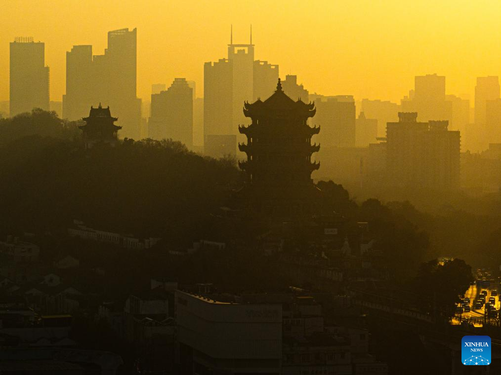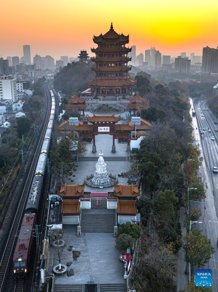 An aerial drone photo taken on Dec. 26, 2025 shows the Yellow Crane Tower at sunrise in Wuhan, central China's Hubei Province. (Xinhua/Xiao Yijiu)