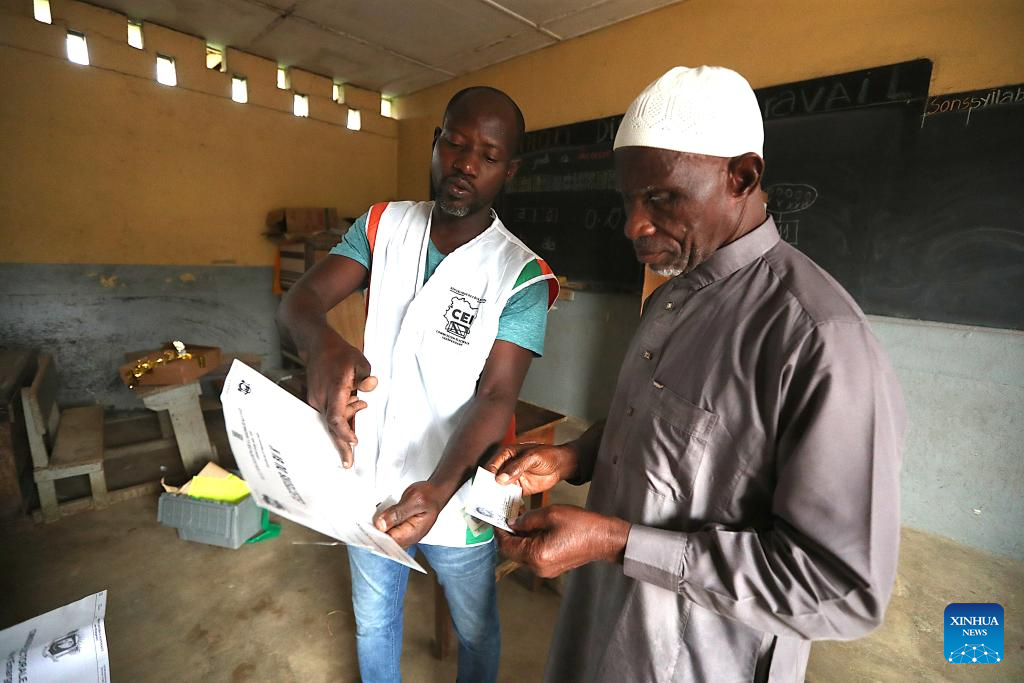A staff member explains the voting rules to a voter at a polling station in Abidjan, Cote d'Ivoire, Dec. 27, 2025. Polling stations opened on Saturday morning across Cote d'Ivoire for legislative elections to renew the 255 seats of the National Assembly, Xinhua reporters observed on site in Abidjan, the country's economic capital.(Photo by Yvan Sonh/Xinhua)