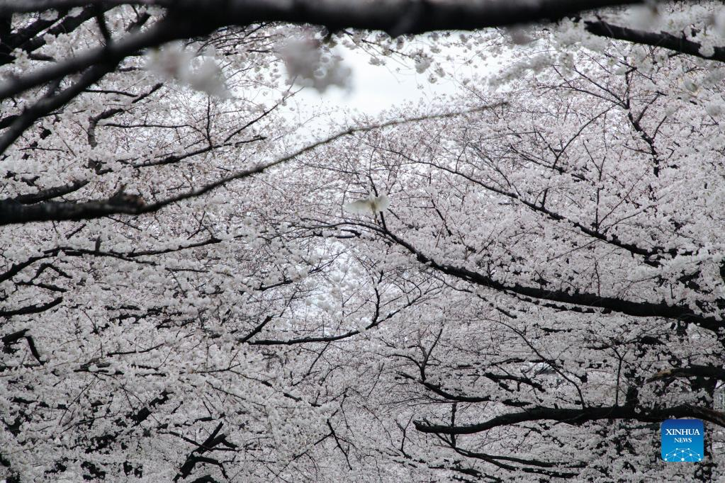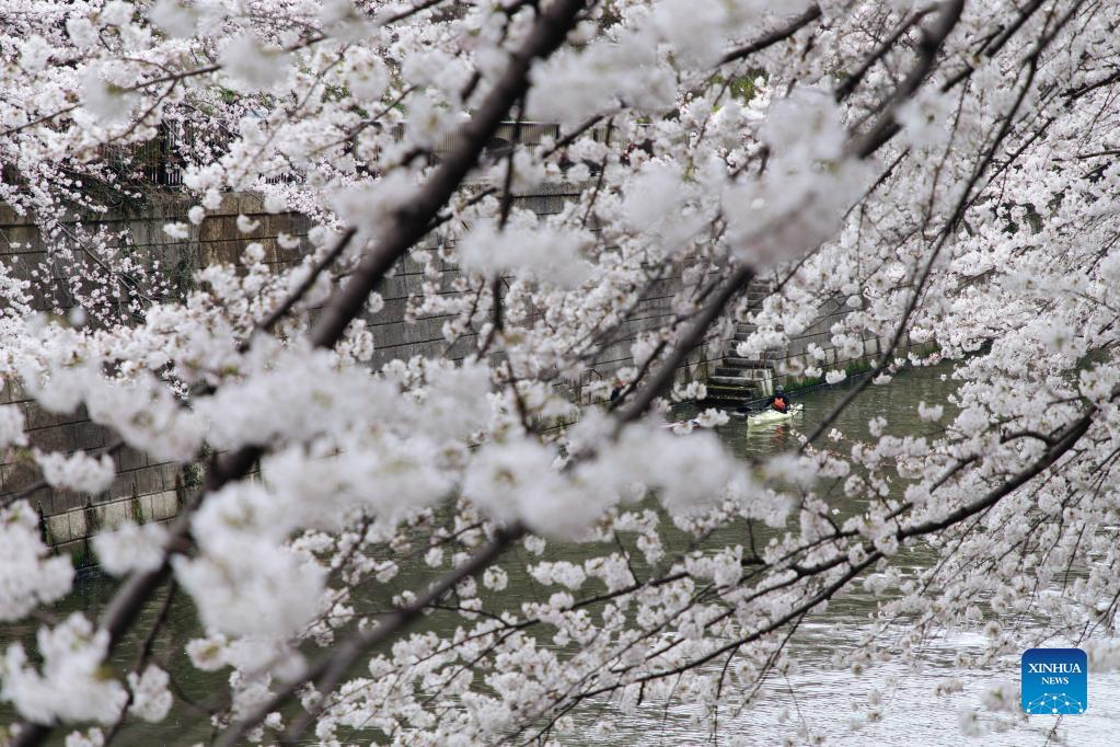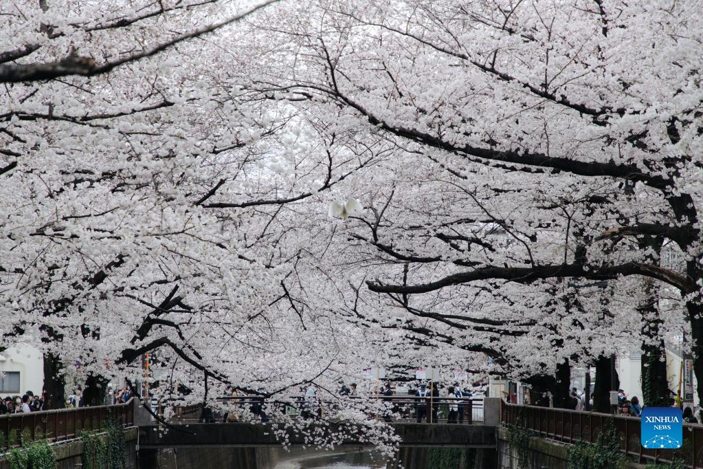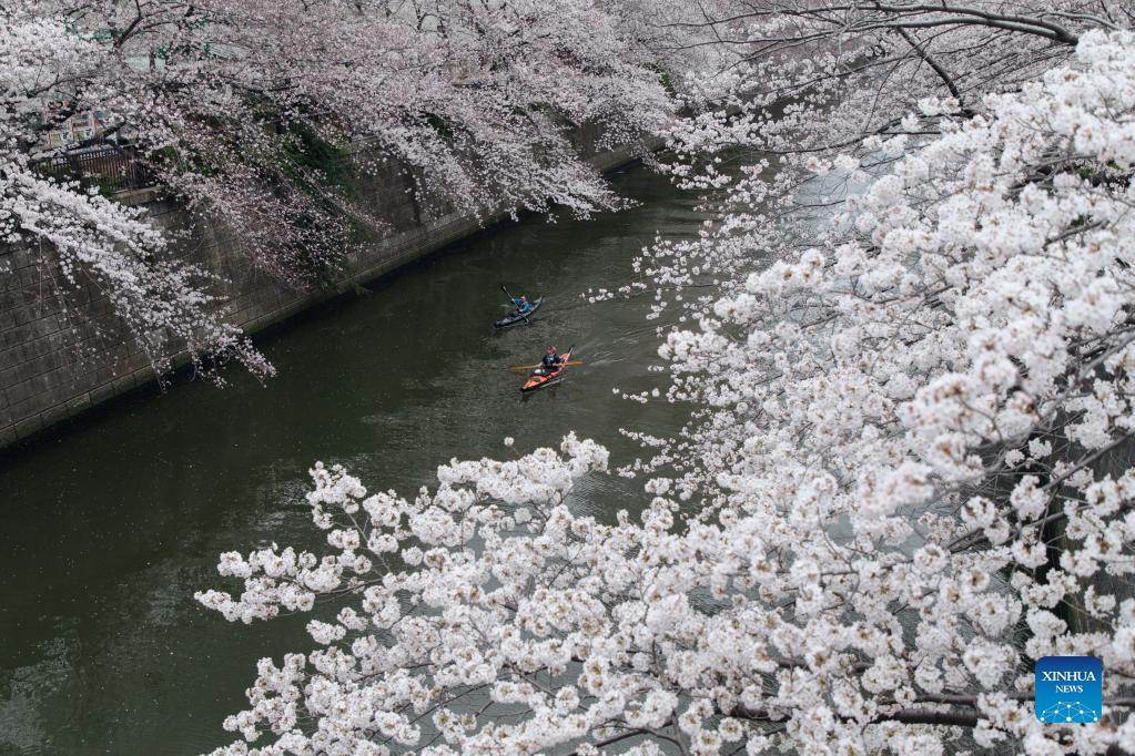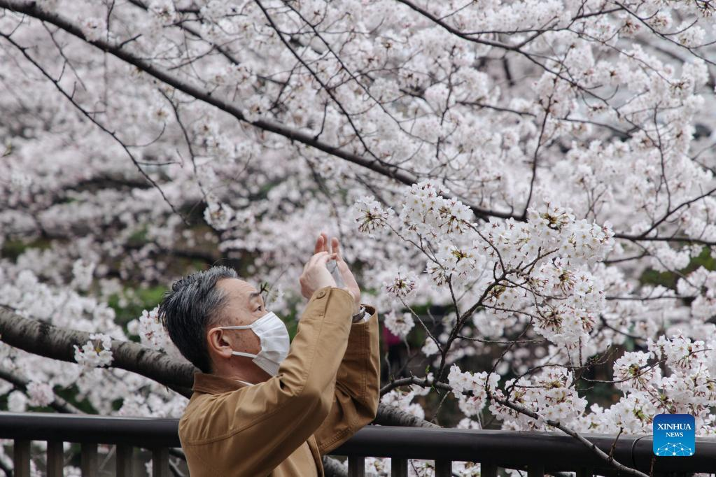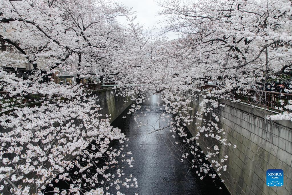 Photo taken on March 27, 2022 shows the view of cherry blossoms along Meguro River in Tokyo, Japan. (Xinhua/Zhang Xiaoyu)