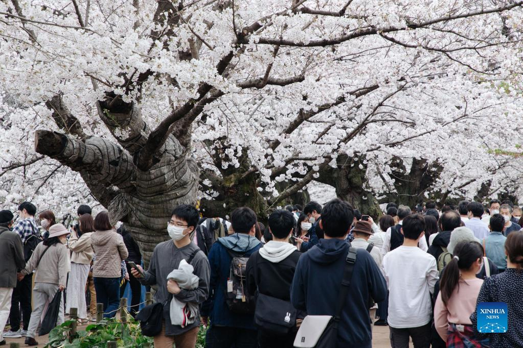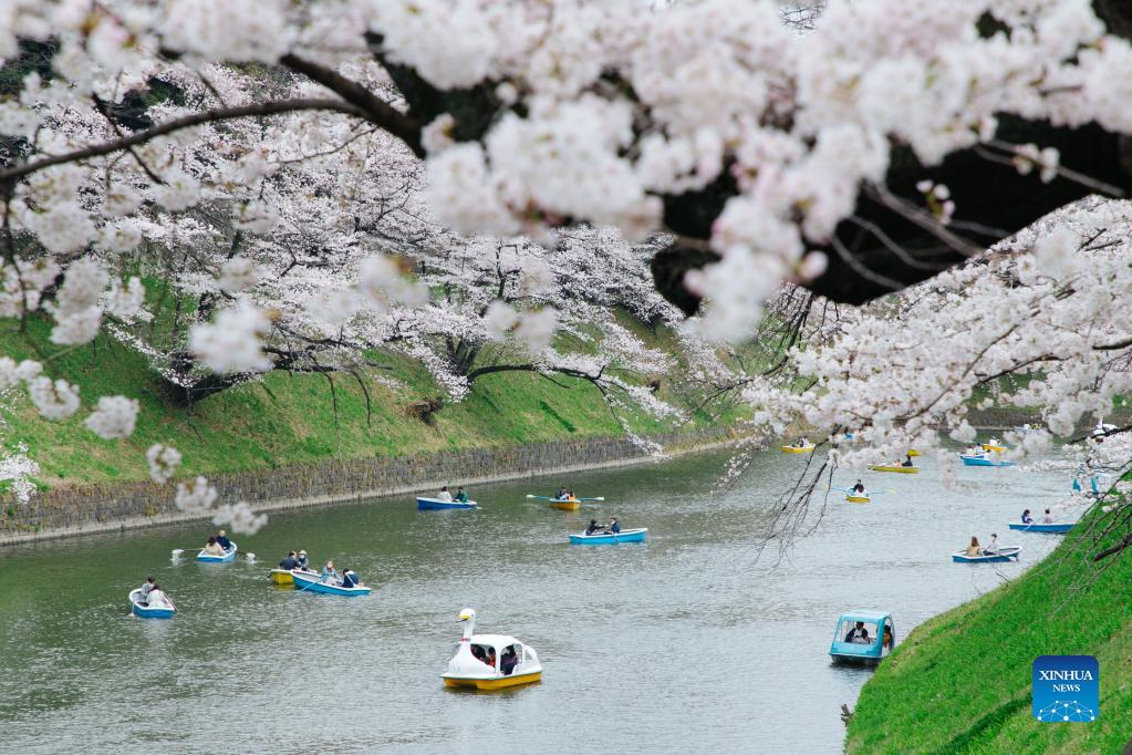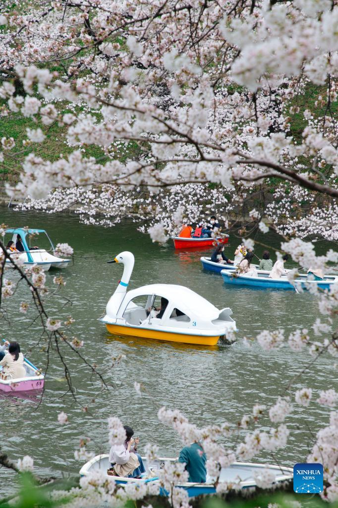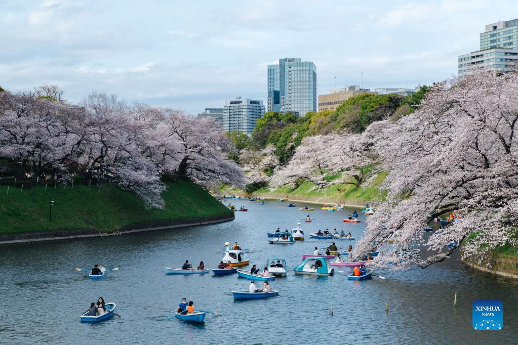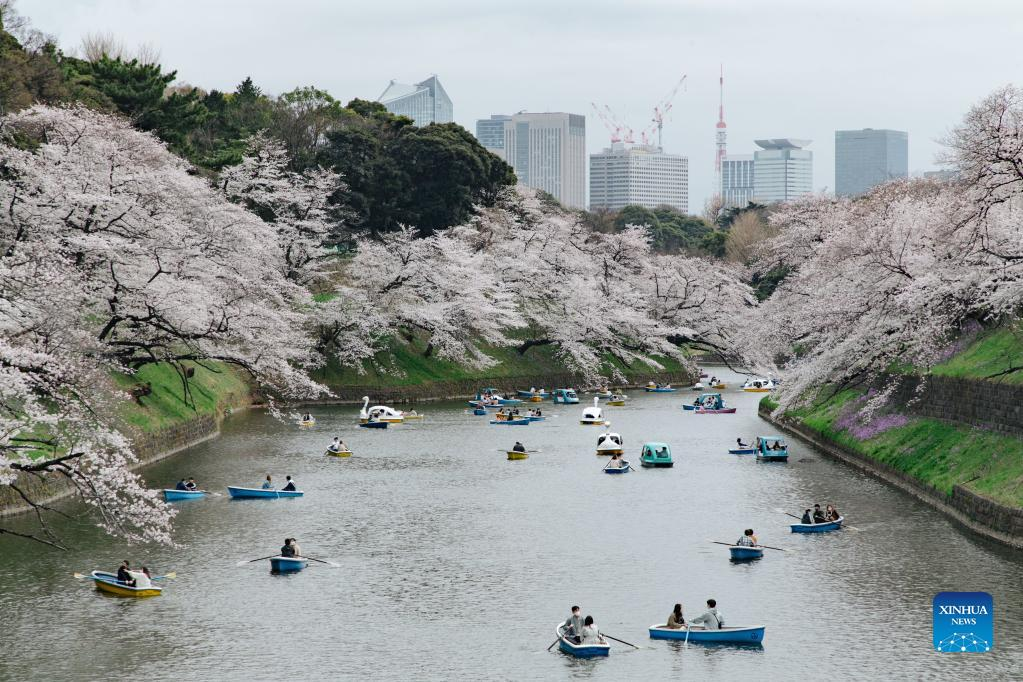 People enjoy the view of cherry blossoms along Chidorigafuchi Moat in Tokyo, Japan, on March 27, 2022. (Xinhua/Zhang Xiaoyu)