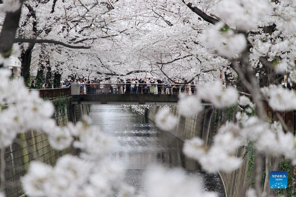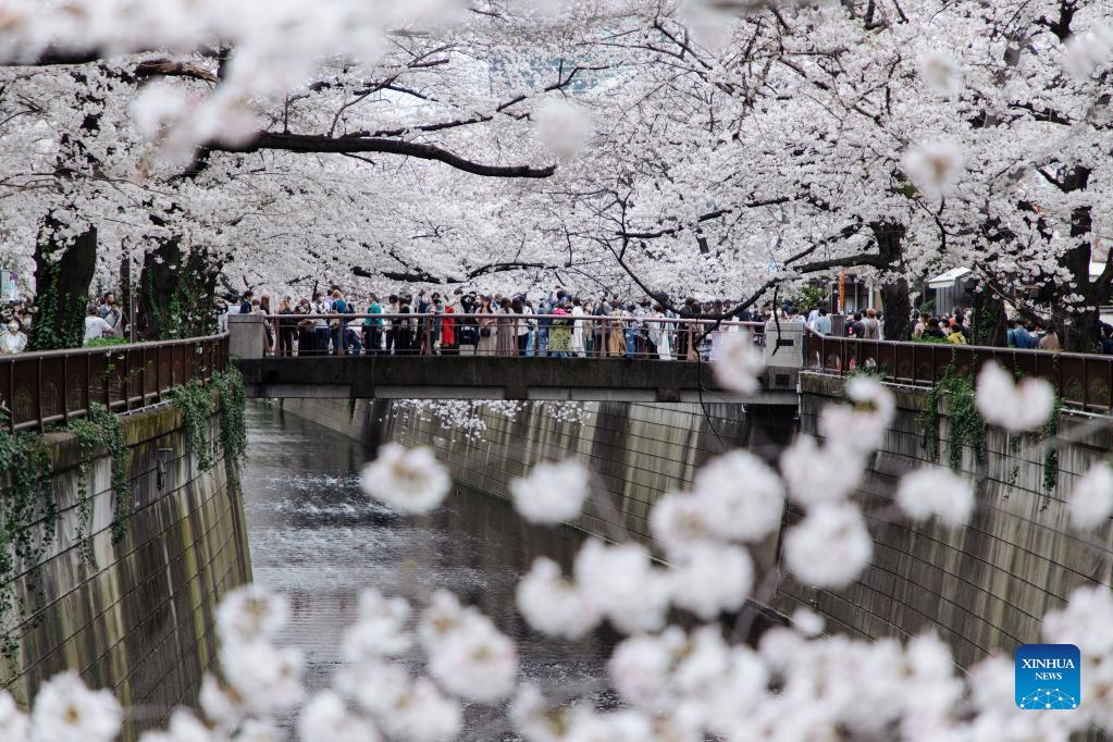 People enjoy the view of cherry blossoms along Meguro River in Tokyo, Japan, on March 27, 2022. (Xinhua/Zhang Xiaoyu)