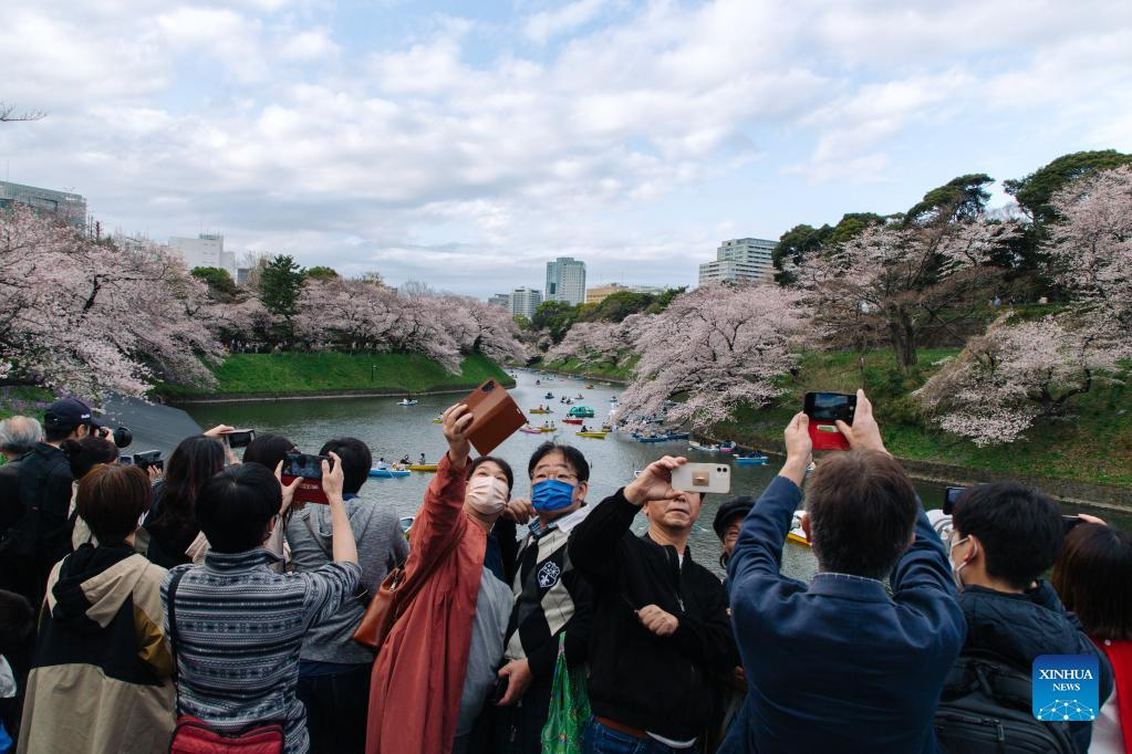 People take pictures of the view of cherry blossoms along Chidorigafuchi Moat in Tokyo, Japan, on March 27, 2022. (Xinhua/Zhang Xiaoyu)