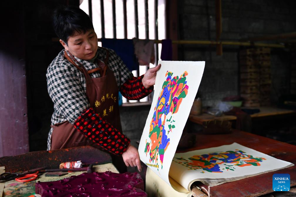 Artist Yin Dongxiang makes copies of nianhua, a type of centuries-old Chinese woodcut New Year picture, at a workshop in Tantou Township of Longhui County, Shaoyang, central China's Hunan Province, Dec. 24, 2025. It is a tradition for Chinese people to paste New Year pictures to celebrate the Spring Festival. The Tantou-style New Year picture, with a history of more than 300 years, was listed as one of China's national intangible cultural heritages in 2006. (Xinhua/Chen Zhenhai)