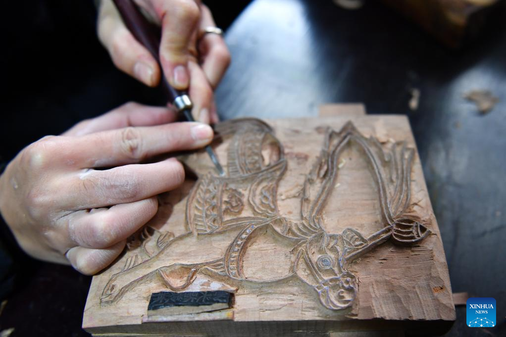 Xiao Yang, daughter of artist Yin Dongxiang, makes a woodcut at a workshop in Tantou Township of Longhui County, Shaoyang, central China's Hunan Province, Dec. 24, 2025. It is a tradition for Chinese people to paste New Year pictures to celebrate the Spring Festival. The Tantou-style New Year picture, with a history of more than 300 years, was listed as one of China's national intangible cultural heritages in 2006. (Xinhua/Chen Zhenhai)