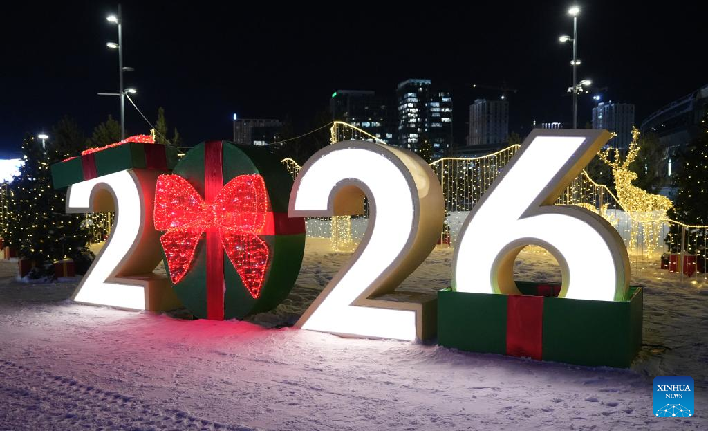 New Year signs and decorations are seen along a street in Astana, Kazakhstan, Dec. 26, 2025. Astana has been adorned in festive decorations recently as the New Year approaches. (Photo by Kalizhan Ospanov/Xinhua)