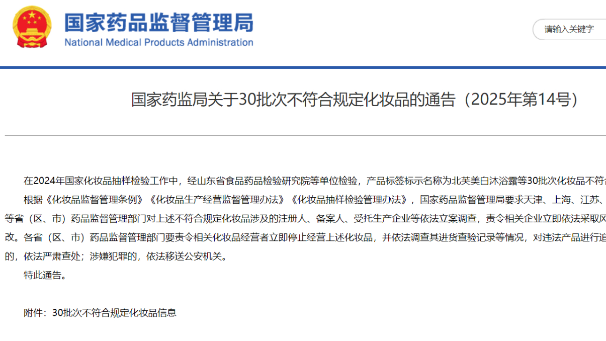 國(guó)家藥監(jiān)局關(guān)于30批次不符合規(guī)定化妝品的通告(2025年第14號(hào))
