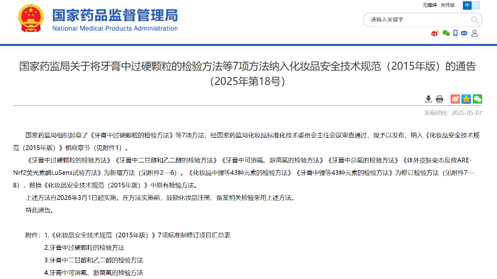 國(guó)家藥監(jiān)局關(guān)于將牙膏中過硬顆粒的檢驗(yàn)方法等7項(xiàng)方法納入化妝品安全技術(shù)規(guī)范(2015年版)的通告(2025年第18號(hào))