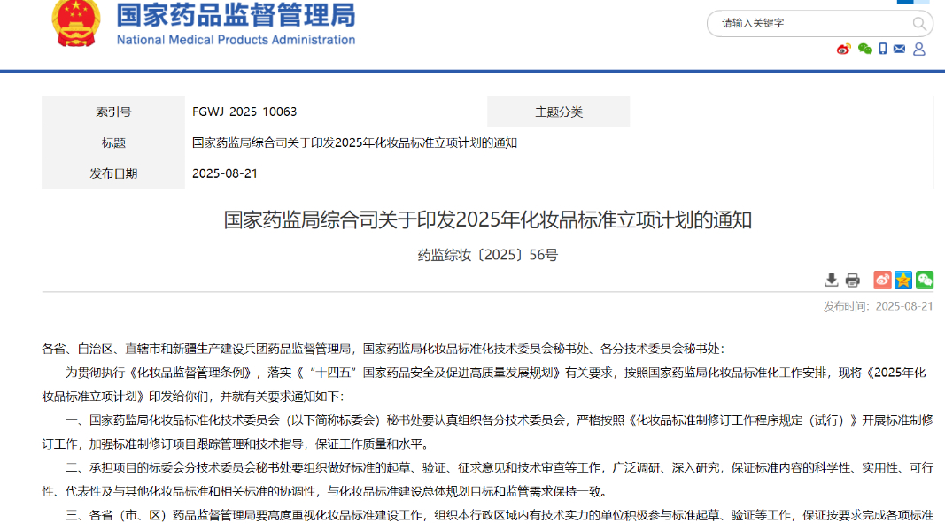 國(guó)家藥監(jiān)局綜合司關(guān)于印發(fā)2025年化妝品標(biāo)準(zhǔn)立項(xiàng)計(jì)劃的通知