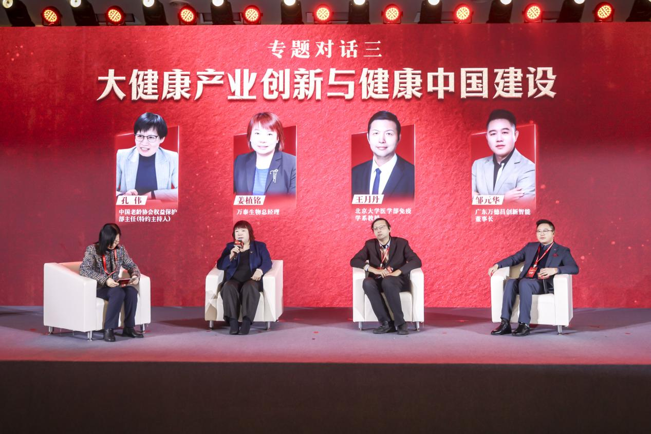 在“大健康产业创新与健康中国建设”专题对话中,中国老龄协会权益保护部主任孔伟、万泰生物总经理姜植铭、北京大学医学部免疫学系教授王月丹、广东万德昌创新智能董事长邹元华,围绕生物疫苗研发、免疫力管理、智能健康硬件应用等核心议题进行了深入研讨,为大健康产业创新与健康中国建设贡献智慧。