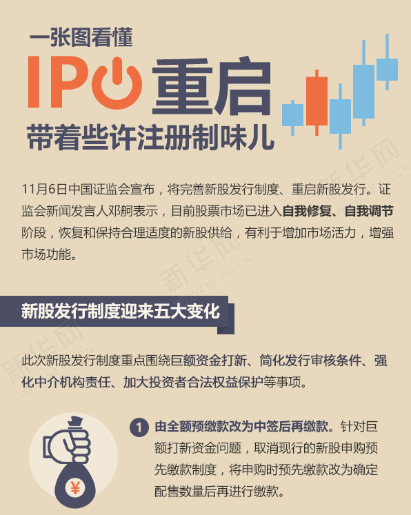 ????新華網(wǎng)北京11月6日電(記者 屈紹輝)6日中國證監(jiān)會宣布,將完善新股發(fā)行制度重啟新股發(fā)行。證監(jiān)會相關(guān)負(fù)責(zé)人表示,此次改革重點(diǎn)圍繞解決巨額資金打新、簡化發(fā)行審核條件、強(qiáng)化中介機(jī)構(gòu)責(zé)任、加大投資者合法權(quán)益保護(hù)等事項,這是新股發(fā)行體制改革的進(jìn)一步深化,朝著股票注冊制改革的方向又邁出了堅實(shí)的一步。