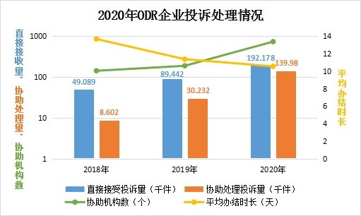 2020年,市場(chǎng)監(jiān)管部門大力推進(jìn)在線糾紛和解機(jī)制建設(shè),努力把消費(fèi)糾紛化解在源頭、解決在基層、和解在企業(yè)。全國(guó)12315平臺(tái)共發(fā)展ODR企業(yè)2.55萬家,主動(dòng)與消費(fèi)者協(xié)商糾紛19.22萬件,與傳統(tǒng)調(diào)解方式相比,和解率高出6.21個(gè)百分點(diǎn),平均處理時(shí)長(zhǎng)縮短7.76天,消費(fèi)者滿意度4.07分(滿分5分),ODR城市覆蓋率由25.60%增加到91.11%。與2019年相比,2020年ODR機(jī)制運(yùn)行質(zhì)量有了明顯提高,投訴處理量、辦理效率、和解成功率、消費(fèi)者滿意度等各方面均有明顯提升,維權(quán)效能日益突顯。
