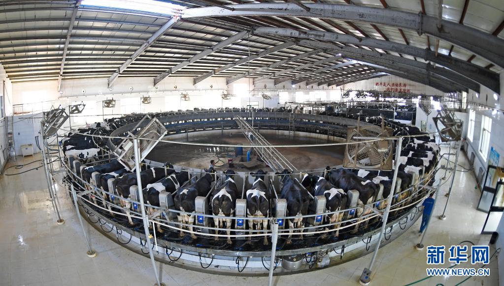 寧夏中衛(wèi)市沐沙牧場的工作人員為自動轉(zhuǎn)盤式奶臺上的奶牛擠奶(2020年9月14日攝)。寧夏中衛(wèi)市沐沙牧場,經(jīng)過7年時間,改造沙漠近萬畝。昔日數(shù)十米高的流動沙丘經(jīng)過治理改造,變身飼草玉米種植基地,荒蕪的沙地變身“奶牛樂園”。