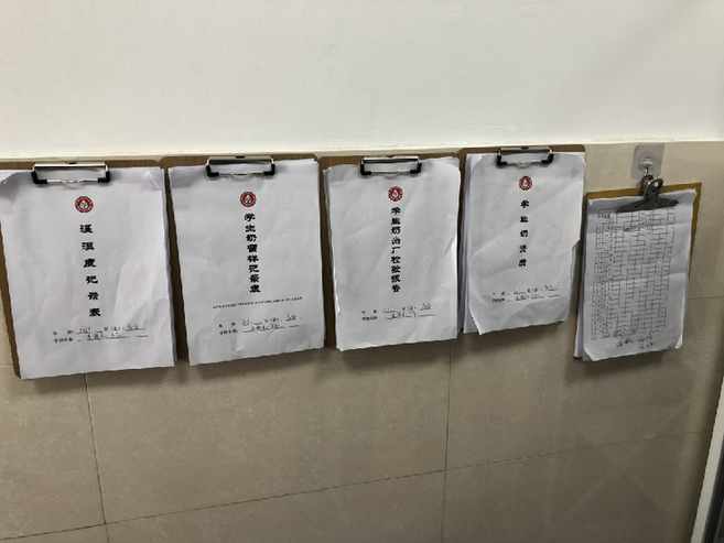 在這些學(xué)校的儲藏室里,學(xué)生奶都按照產(chǎn)品底層墊托板、四周離墻、離地15cm以上等嚴(yán)格要求擺放儲存。學(xué)校的墻上還掛著關(guān)于學(xué)生奶的儲存、領(lǐng)取與分發(fā)、不適反應(yīng)處理流程等規(guī)章制度。
