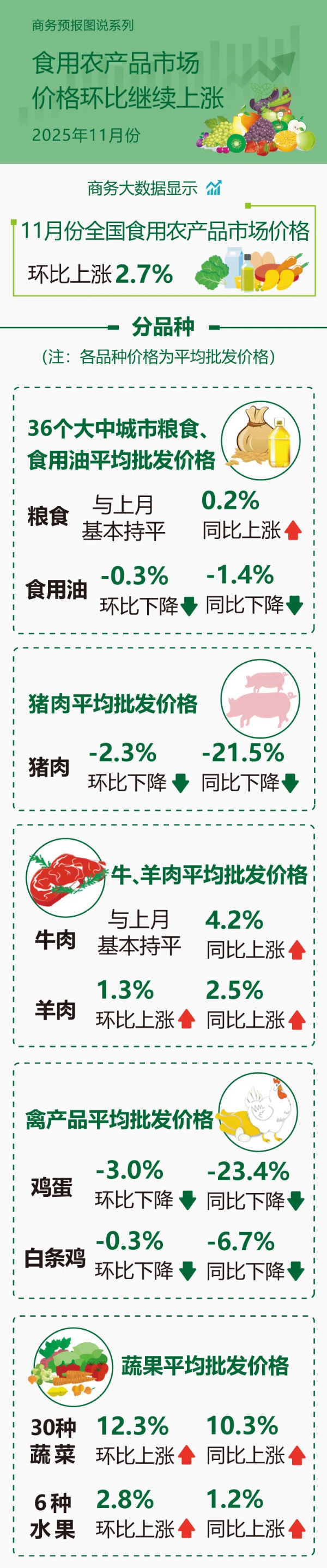 商务大数据显示,11月份全国食用农产品市场价格环比上涨2.7%。