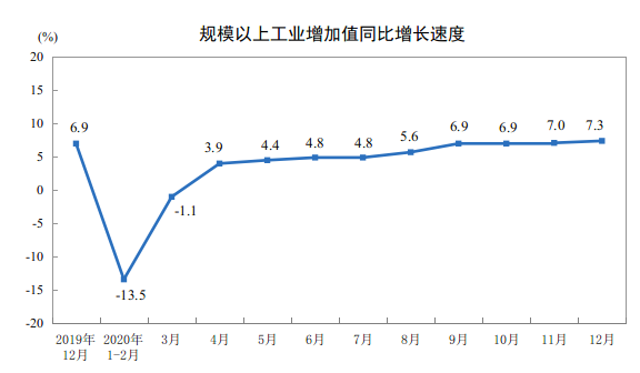12月份,規(guī)模以上工業(yè)增加值同比實際增長7.3%(以下增加值增速均為扣除價格因素的實際增長率),增速較11月份加快0.3個百分點。從環(huán)比看,12月份,規(guī)模以上工業(yè)增加值比上月增長1.10%。2020年,規(guī)模以上工業(yè)增加值比上年增長2.8%。