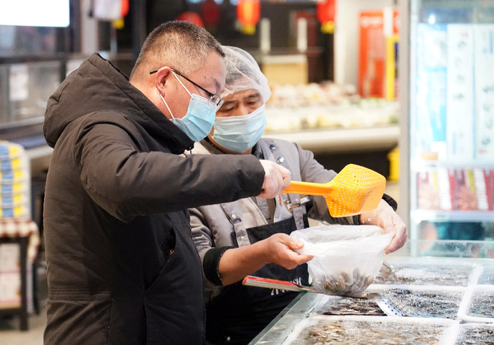 2月15日,在北京市海淀區(qū)的七鮮超市北京華宇店,顧客(左)挑選鮮活水產(chǎn)品。新華社記者 任超 攝