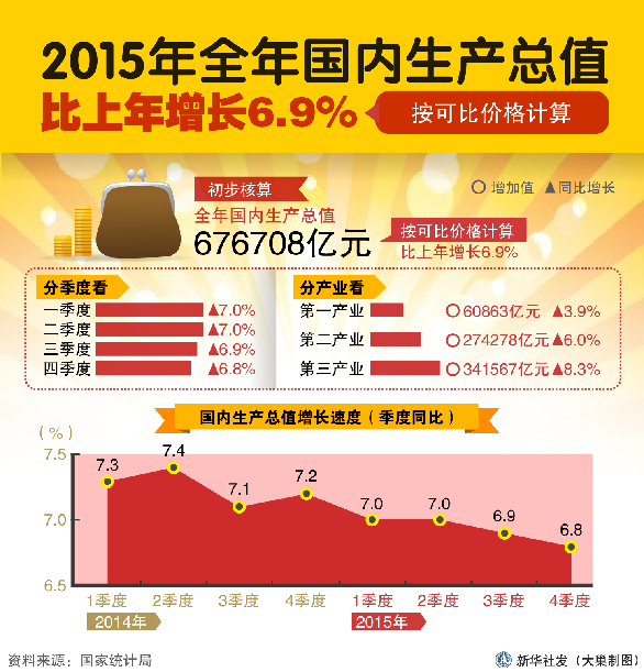 ??? 新華網(wǎng)北京1月19日電(陳凱茵 萬方)中國經(jīng)濟2015全年成績單今日出爐。據(jù)國家統(tǒng)計局數(shù)據(jù),2015年國內生產(chǎn)總值676708億元,比上年增長6.9%。國家統(tǒng)計局局長王保安表示,2015年經(jīng)濟保持了總體平穩(wěn)、穩(wěn)中有進、進中有創(chuàng)、創(chuàng)中提質的發(fā)展態(tài)勢。
