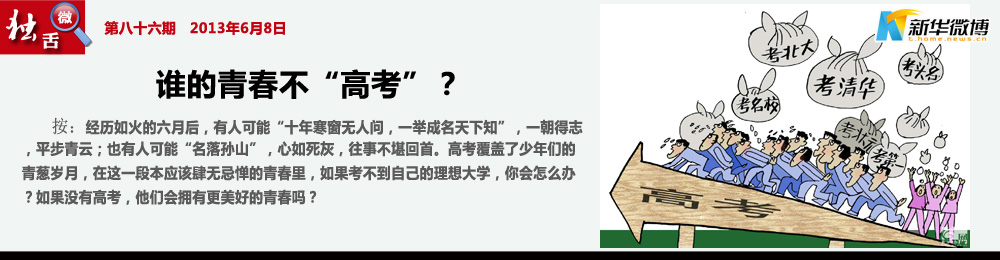 【為經(jīng)濟做貢獻】 算算高考,用了12年青春,至少四五十萬的學費,我們養(yǎng)活了晨光廠、真彩廠、機讀卡廠、無數(shù)造紙廠、無數(shù)印刷場,翰林書店、新華書店,城市的交通行業(yè),學校周邊的飯館,以及所有老師的工資獎金、校長的車、油錢……高考是國家支柱型民營企業(yè)!這就是我們的功勞!