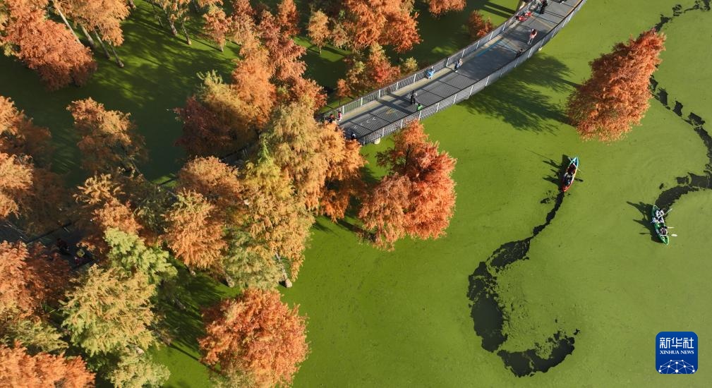 随着气温降低,浙江省杭州市青山湖的近百亩池杉、落羽杉披上色彩斑斓的“衣装”,和水面碧绿的浮萍相映成景。