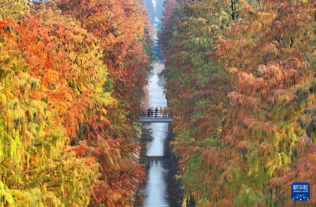 12月10日,游客在湖南省衡阳市雁峰区岳屏镇隆桥村的水杉林休闲游玩(无人机照片)。