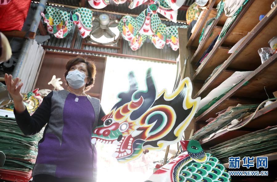 描完了邊,蘭姐直起身來,指指墻上一對(duì)龍頭魚身的紙?jiān)煨驼f:“這是鰲魚,是我父親當(dāng)年親手做的,上面的油漆重新涂過,但龍骨支架已超過60年啦。”