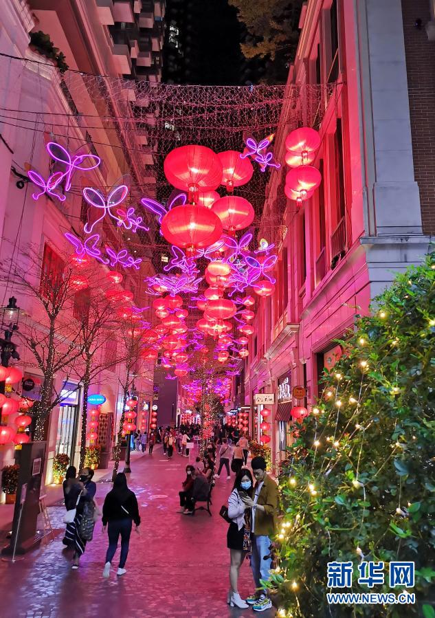 維港中環(huán)碼頭、港島利東街等香港知名地標,也迎來不少市民。利東街上掛滿了紅彤彤的燈籠,襯托著色彩繽紛的蝴蝶藝術(shù)裝置。一排排粉色桃花、年桔和其他各色年花,吸引不少市民拍照。街上的大人小孩甚至小寵物,都經(jīng)過精心打扮,有的防疫口罩被設(shè)計成紅色,別具新春氣息。