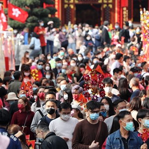 初一下午,大批市民在黃大仙祠前的廣場上排成長龍,有序往前“流動”。入口處豎立著一塊電子顯示屏,上有祠內(nèi)人數(shù)實況,提醒門口防疫人員何時放行。