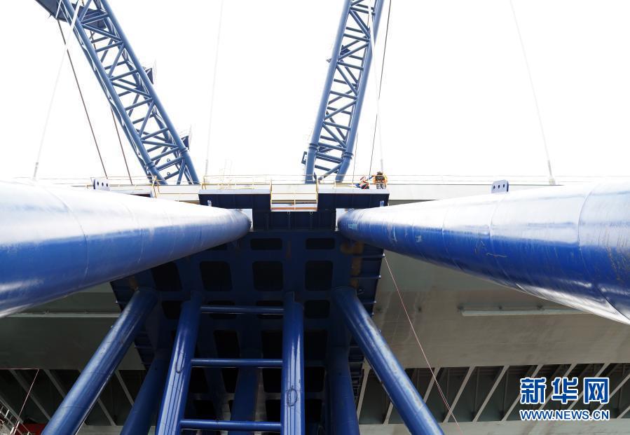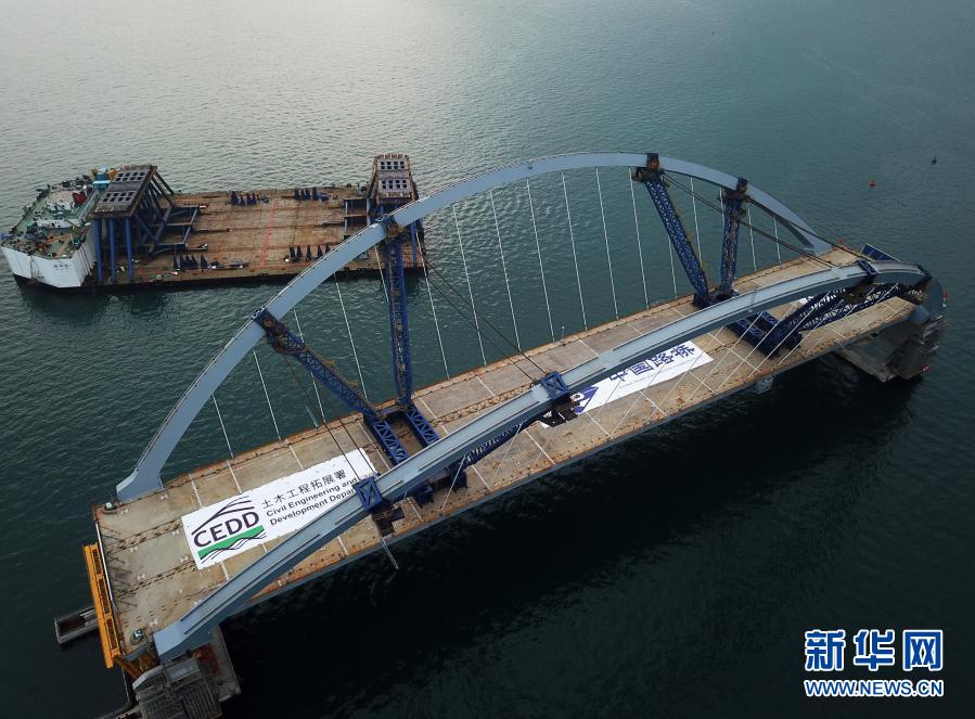 “冒出來(lái)”的并不是一座完整的大橋,而是一段跨徑長(zhǎng)達(dá)200米的雙拱鋼橋,在海面中央兀然矗立。“這是我們大橋工程最核心的主橋部分,技術(shù)難度最大,對(duì)整個(gè)項(xiàng)目有里程碑的意義?!背薪▎挝恢袊?guó)路橋工程有限公司董事、項(xiàng)目總指揮闞軍說(shuō)。