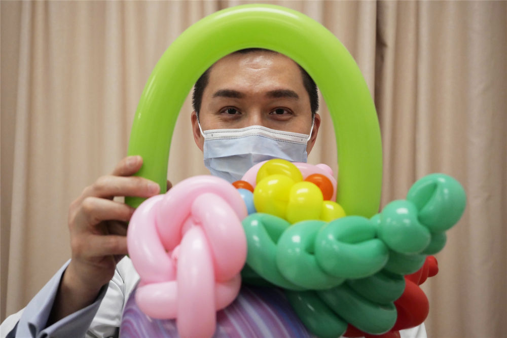 陳諾文是東區(qū)醫(yī)院的兒童及青少年科副顧問醫(yī)生。之前,為了拉近與小患者的距離,陳諾文不時親手制作氣球卡通玩偶送給他們,因而練就純熟的氣球“手藝”,被小患者們親切地稱為“氣球大夫”。疫情暴發(fā)后,他總想看看有什么地方能幫得上忙,為抗疫加油。沒想到,氣球“手藝”就這樣派上了用場。