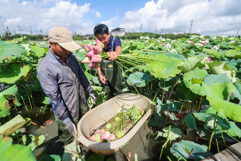 7月23日,种植户在海宁市海昌街道双山村的“武莲海种”荷花基地采收荷花和莲蓬。