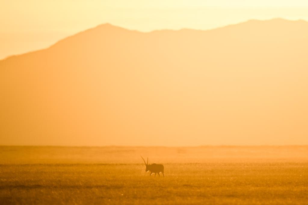 在阿尔金山国家级自然保护区,一只雄性藏羚羊在日出时分觅食(12月7日摄)。