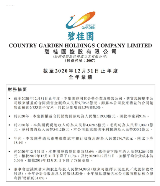 公告顯示,全年碧桂園營業(yè)收入4628.6億元,毛利約為1009.1億元,凈利潤541.2億元。得益于公司持續(xù)加強(qiáng)對回款目標(biāo)的考核,強(qiáng)化標(biāo)準(zhǔn)化、精細(xì)化的管理機(jī)制,碧桂園的回款率依舊保持高位。截至期末,共實(shí)現(xiàn)權(quán)益合同銷售現(xiàn)金回款額約人民幣5193億元,權(quán)益回款率達(dá)91%,連續(xù)五年高于90%,在行業(yè)繼續(xù)保持領(lǐng)先,反映了強(qiáng)勁的自身造血功能。