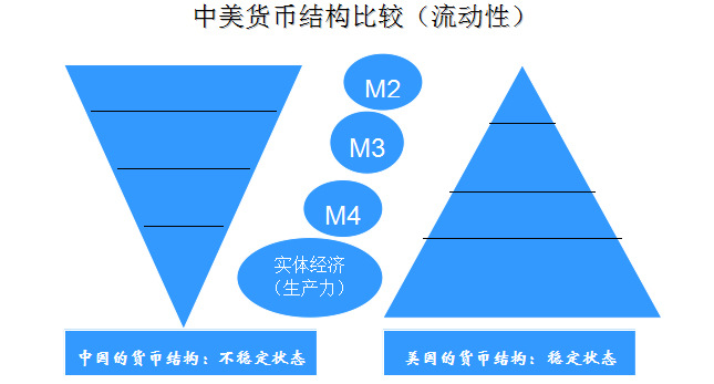 從M3或更多的貨幣層次考察,情況完全不同。美國(guó)的M3達(dá)到400多萬(wàn)億人民幣,是中國(guó)的3倍,日本達(dá)300多萬(wàn)億人民幣,是中國(guó)的2倍。從M3以上的層次考察,美國(guó)的貨幣供給更多。中國(guó)的貨幣問(wèn)題不是數(shù)量問(wèn)題,主要是結(jié)構(gòu)和效率問(wèn)題?!暗谷切巍钡呢泿沤Y(jié)構(gòu)表明中國(guó)金融體系不穩(wěn)定,較易發(fā)生金融動(dòng)蕩和風(fēng)險(xiǎn),中國(guó)貨幣層次中,M3以下逐步減少,越距實(shí)體經(jīng)濟(jì)貨幣越少,金融對(duì)實(shí)體經(jīng)濟(jì)的支持小。大量貨幣呈現(xiàn)高流動(dòng)性,容易引發(fā)通脹。金融資源配置效率低下,資金的信息化程度低,有效產(chǎn)出率不高。美國(guó)貨幣結(jié)構(gòu)特征是,貨幣的基礎(chǔ)層次龐大,接近實(shí)體經(jīng)濟(jì)的貨幣供給充分,金融市場(chǎng)效率高;M3、M4等吸納貨幣功能強(qiáng),有利于治理通貨膨脹,美國(guó)的貨幣層次甚至延伸到全球,為美國(guó)治理通脹提供了充分的工具。