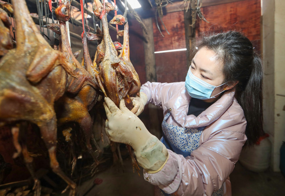 1月23日,在貴州省玉屏侗族自治縣田坪鎮(zhèn)彰寨村的一家山雞臘制品作坊,工作人員查看臘山雞熏制情況。春節(jié)將至,作坊抓緊生產(chǎn),供應(yīng)年貨市場。新華社發(fā)(胡攀學(xué)攝)
