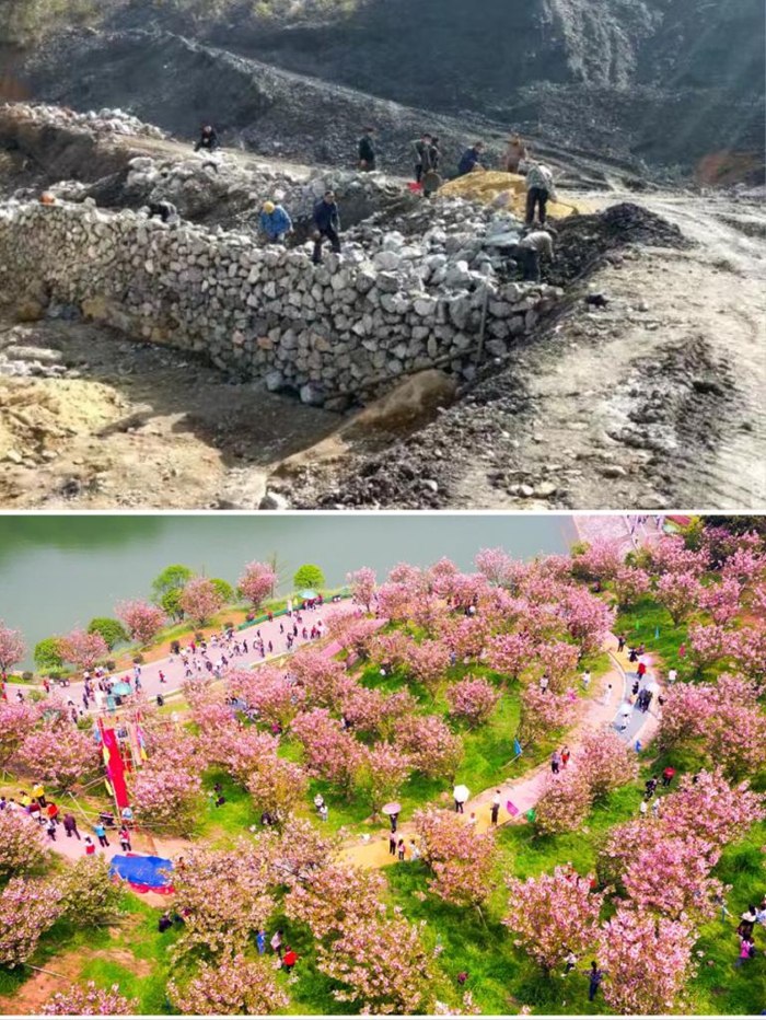 拼版圖片:上圖,安源區(qū)城郊管委會(huì)略下村生態(tài)修復(fù)前礦山裸露;下圖,生態(tài)修復(fù)后“陽(yáng)光花?!本跋?。(萍鄉(xiāng)市委宣傳部供圖)