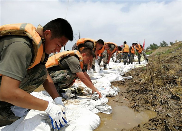 ????第71集團(tuán)軍某旅工兵連官兵在江西九江柴桑區(qū)江洲鎮(zhèn)江新洲堤上展開搶險任務(wù)。新華社發(fā)(郭仁杰 攝)