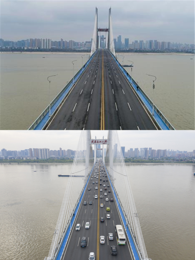 ▲上圖為2020年1月27日的武漢長江二橋。來源:中國日?qǐng)?bào);下圖為2020年4月14日的武漢長江二橋。新華社記者 才揚(yáng) 攝