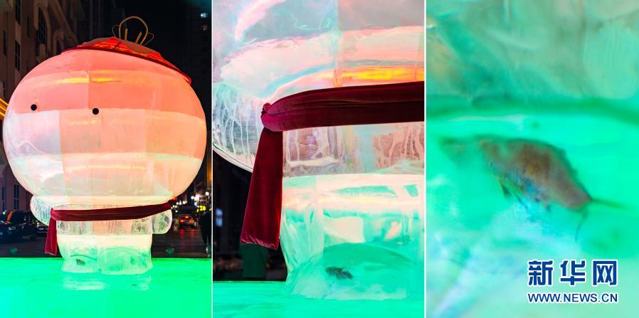 2021年1月1日,在哈爾濱中央大街一處冬奧主題的冰建景觀中,“雪容融”的右腳里有條魚(拼版照片)。有游客在發(fā)現(xiàn)這條魚后笑稱,這是真正的江冰。