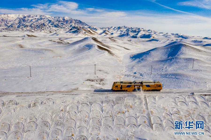 軌道除雪車在瑪依塔斯風(fēng)區(qū)克塔鐵路沿線進(jìn)行清雪作業(yè)(1月21日攝,無(wú)人機(jī)照片)。新華社記者 胡虎虎 攝