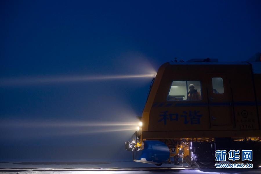 軌道除雪車載著工人緩緩駛出鐵廠溝維修工隊(duì)的車庫(kù)(1月21日攝)。新華社記者 胡虎虎 攝