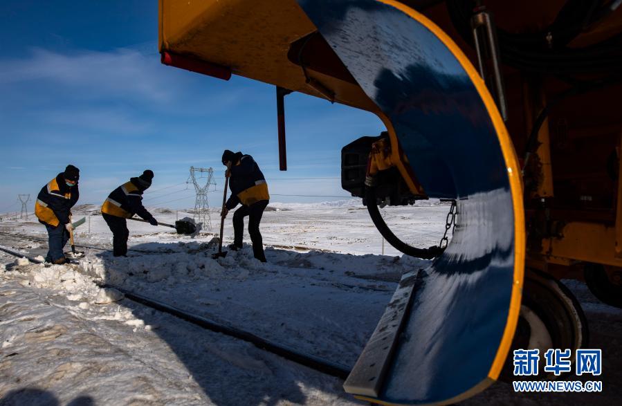 鐵廠溝維修工隊(duì)的工人在瑪依塔斯風(fēng)區(qū)克塔鐵路沿線清除一處板結(jié)嚴(yán)重的積雪(1月21日攝)。新華社記者 胡虎虎 攝