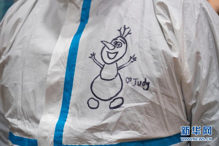1月23日,在哈爾濱市兆麟社區(qū)核酸檢測點,一位在值守的工作人員因為值班幾天沒有回家,想念女兒,就在防護服上畫了女兒喜歡的卡通形象,寫上了女兒的名字。新華社記者 謝劍飛 攝