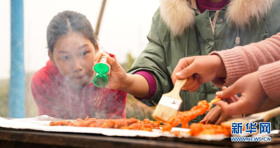 2月3日,竹亭鎮(zhèn)中心小學(xué)4年級學(xué)生李玉春在看大家烤肉。新華社記者 胡晨歡 攝
