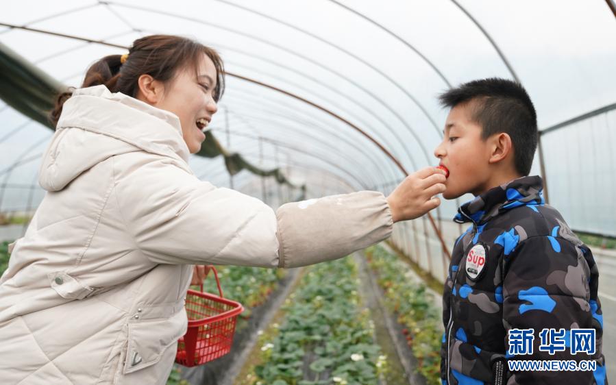 2月4日,王翩(左一)帶著學(xué)生在竹亭鎮(zhèn)脊嶺村的草莓基地內(nèi)采摘草莓。新華社記者 胡晨歡 攝