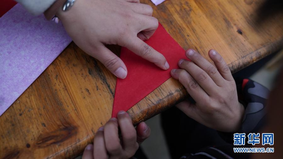 2月4日,王翩(左)和學(xué)生們一起剪紙。新華社記者 胡晨歡 攝